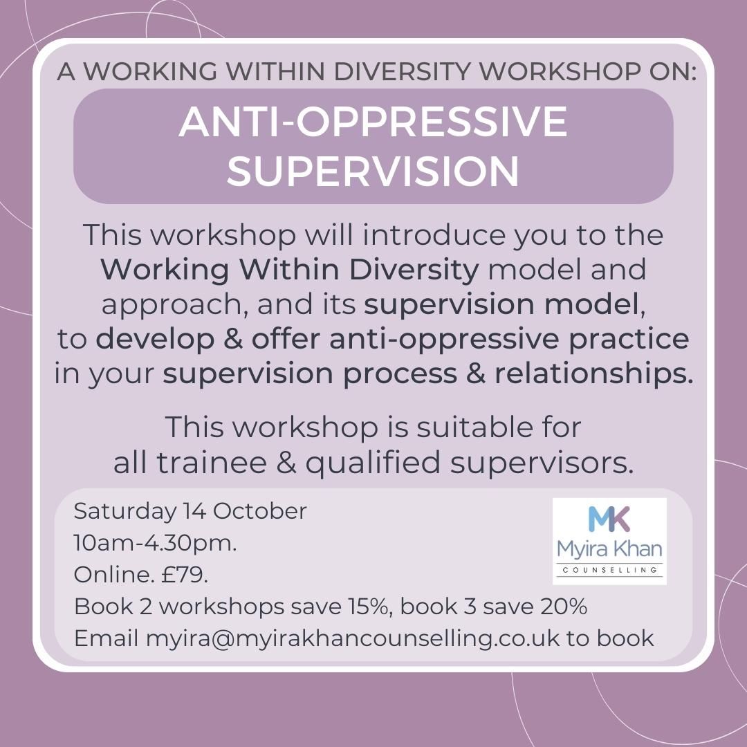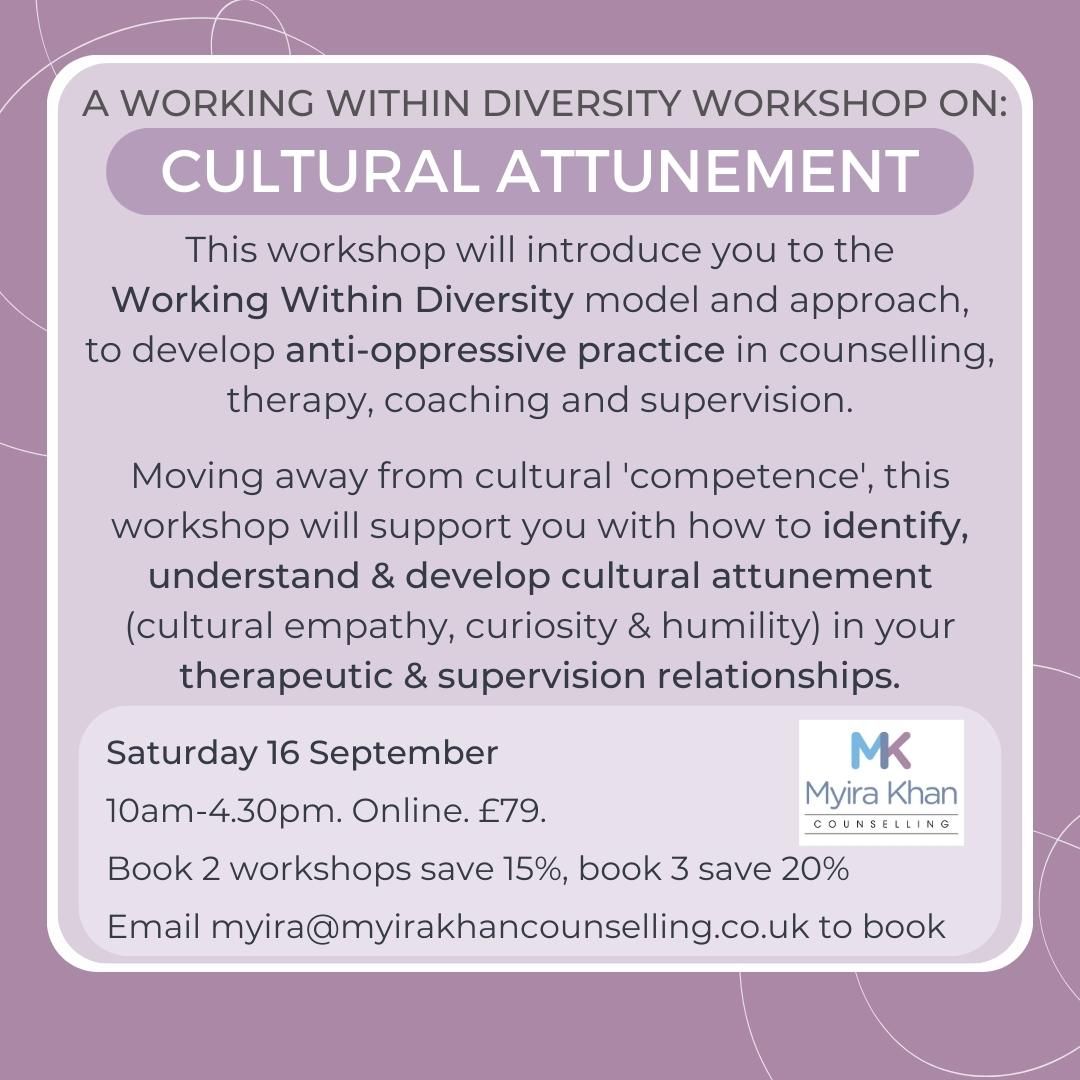 To book onto any training or workshop - please email myira@myirakhancounselling.co.uk
